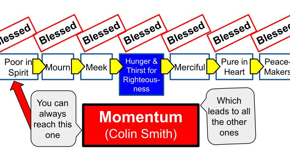 Pastor Colin follows Martin Lloyd Jones who followed Charles Spurgeon who interpreted the beatitudes as sequential — each one propelling you to the next, thereby building momentum in your Christian life. It is vital not to misinterpret this presentation as if the beatitudes provide a pathway toward self-salvation by works. Exactly the opposite, in fact, is true!